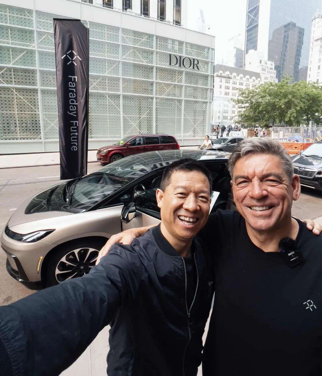 在出发前往交易所之前,贾跃亭难掩兴奋,与毕福康在FF 91的车前合了一张影。