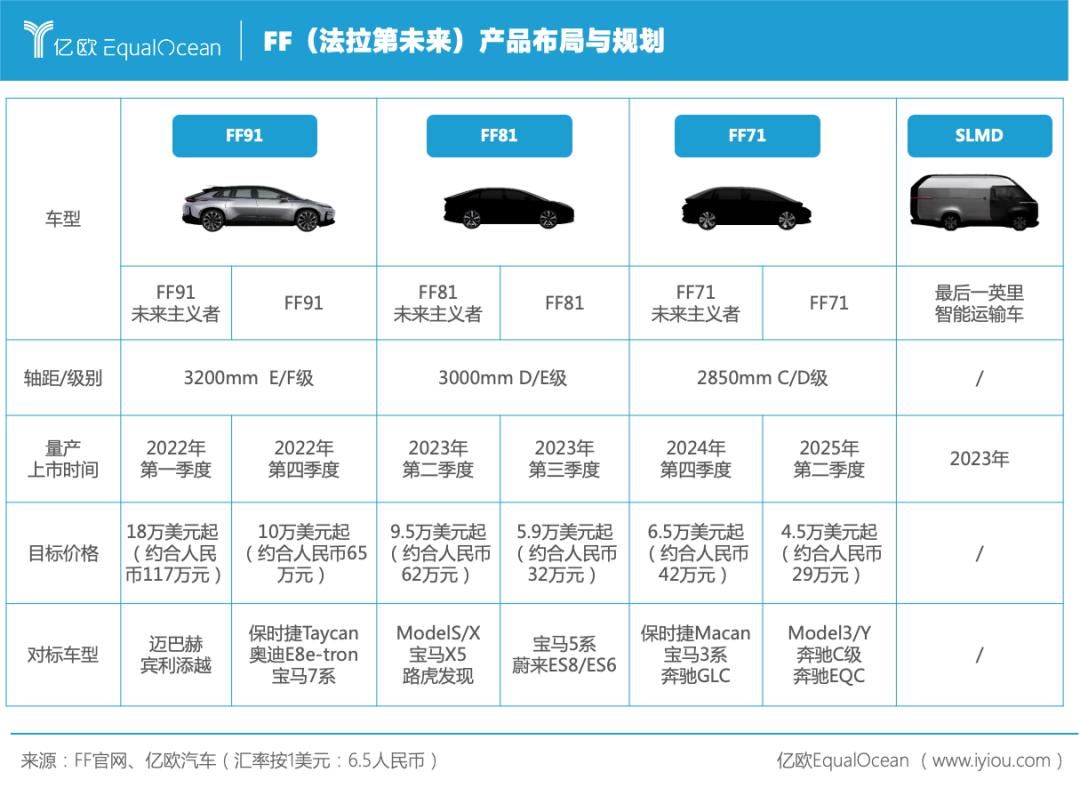 据亿欧汽车了解,FF共有两条产品线,分别是FF乘用车和FF SLMD(最后一英里智能运输车),其中最先量产交付的是FF 91,价格预计18万美元起,折合人民币高达117万元,对标车型是迈巴赫与宾利添越。