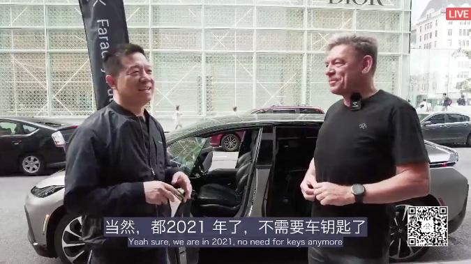 在纽约一家临近时代广场的FF体验店中,FF CEO毕福康从一辆FF 91中走出来,他介绍完FF的产品和愿景后,走近那辆FF 91的后排车门,轻轻敲了敲车窗,露出了满脸堆笑的贾跃亭。