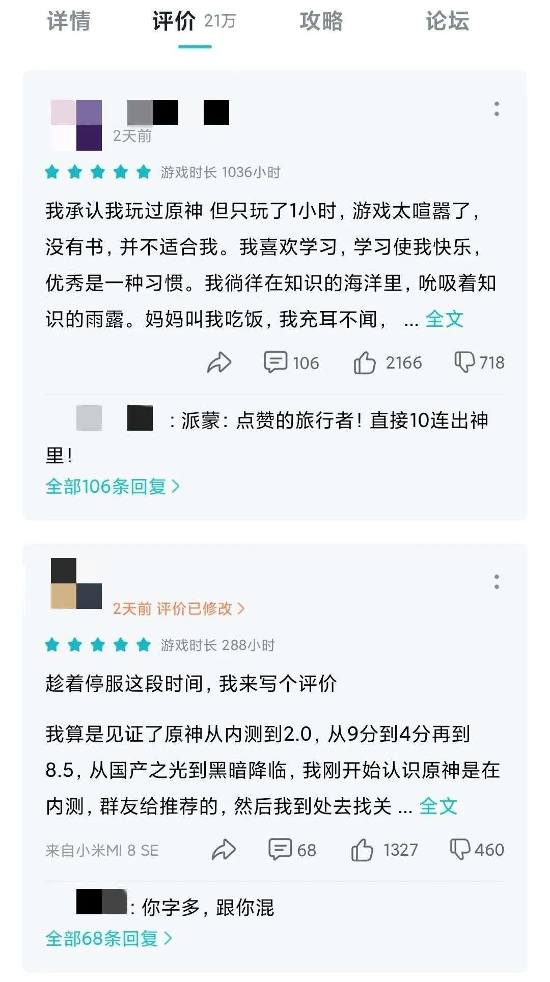 小远的记忆里,最糟的时候不能说《原神》一句好话,否则会被人追着发私信,“骂什么的都有”。在国内知名手游平台TapTap,《原神》前期的评分低谷不足3分,平稳期则在4到5分上下徘徊。