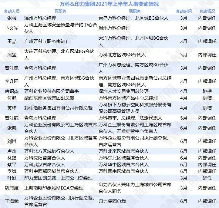 万科及印力集团上半年合计共19名高管变动,其于6月宣布全面加速“开发经营服务并重”的转型发展,将研究与开发专业公会将改组为开发经营中心,上海区域总张海兼任该中心负责人,同时王海武主动请缨出任印力集团总裁以加速商业发展,原北方区域总刘肖接任集团执行副总裁兼首席运营官等。