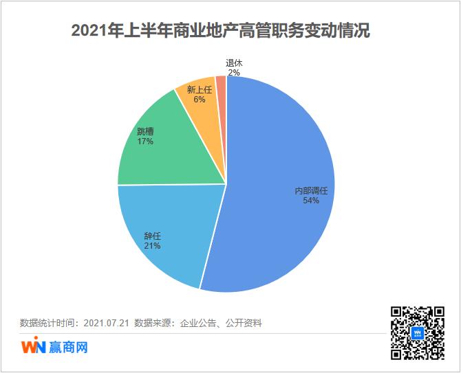 据赢商网不完全统计,2021年上半年商业地产圈高管变动人数达299名(不含董事职务调整,完整名单附后),少于2020年同期赢商网团队统计到的484名,但并不意味着行业趋于平静。其中,内部调任涉及163名高管,占比过半;有68名高管离职(辞任/退休),占变动总人数的23%;有52名高管跳槽,占变动总人数的17%。