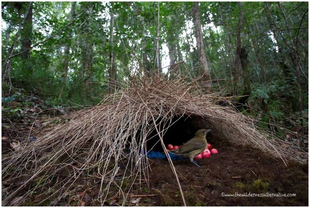 在澳大利亚树林中,雄园丁鸟会利用小树枝搭建、装饰求偶亭吸引雌鸟,这一充满智慧和美感的行为让它们被誉为“鸟类建筑家“。