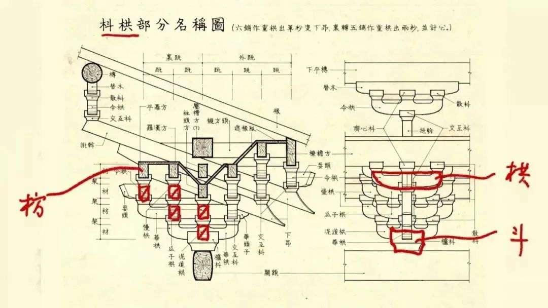 《营造法式》斗栱各部分名称示意图,来源:清华大学建筑学院中国营造学社纪念馆