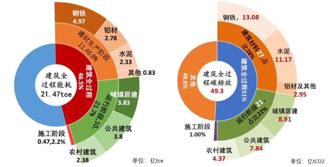 中国建筑节能协会《中国建筑能耗研究报告(2020)》2018年我国建筑全过程能耗占全国能源消费总量的46.5%,碳排放总量占全国碳排放总量的51.3% ,其中建筑生产阶段(材料)和运行阶段为主要占比