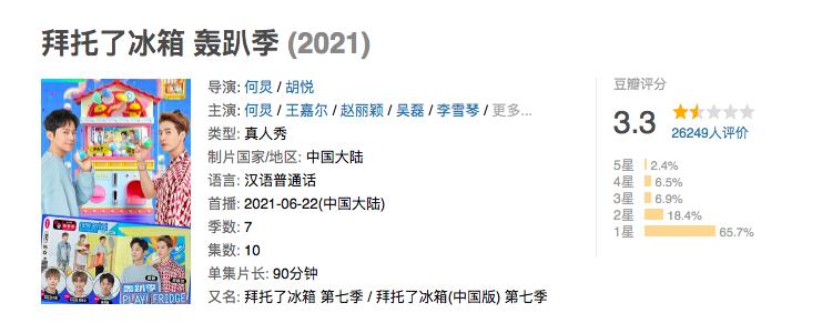 作为曾经的下饭综艺“天花板”,《拜托了冰箱 轰趴季》前两期的豆瓣评分只有2.9分,这是很多观众始料未及的,虽然第三期节目后口碑稍显回升,也仅上升到了3.3分,点开豆瓣评论区,一星差评率高达65.7%。