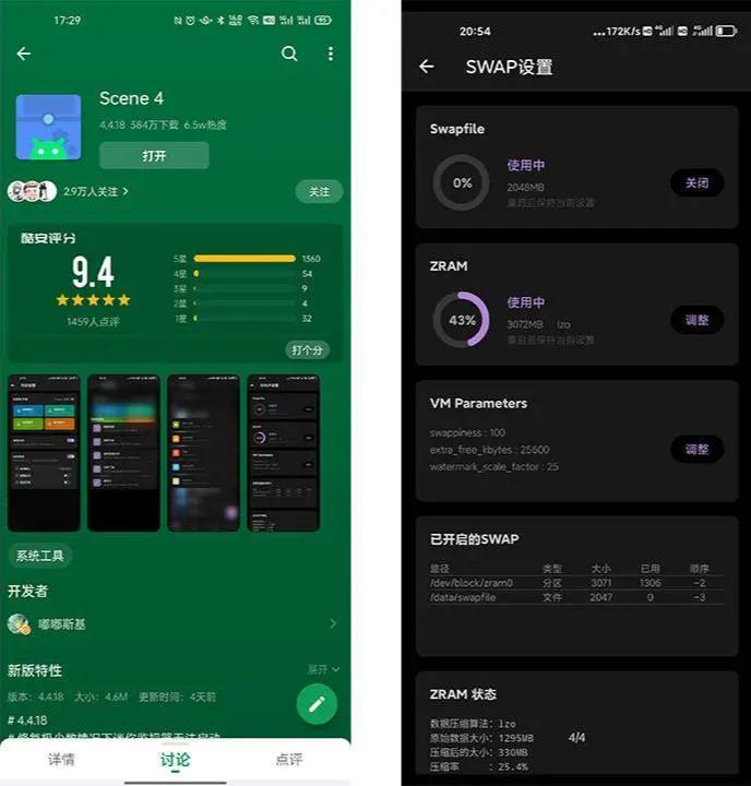 在酷安上,有个叫做 Scene 4 的软件。它里面有个「SWAP 设置」的选项,进入后会有 Swapfile 与 ZRAM 两个功能。