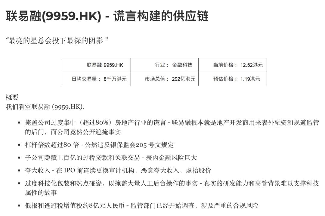 但做空机构的报告列举了联易融存在的六大风险问题,措辞严厉,几乎全盘否定了这家公司: