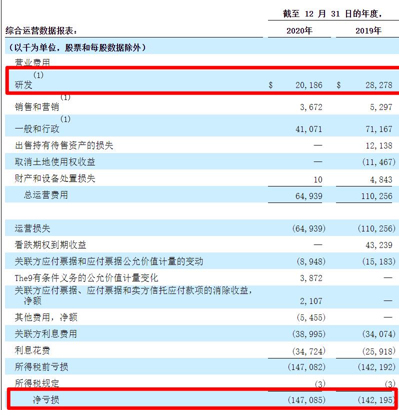 那么FF到底能不能承担的起这样的使命?目前来看,由于FF91还未量产,造车依然在烧钱阶段。招股书数据显示,2019-2020年,FF净亏损1.42亿美元、1.47亿美元。截至2020年12月31日,FF累积亏损23.9亿美元。其中,最被业内诟病的是其研发费用,虽然毕福康称此前几年已经共计在研发上投入了超过20亿美元,但2020年,FF研发费用仅为2018.6万美元(约1.3亿人民币),仅占到成本的13.7%。