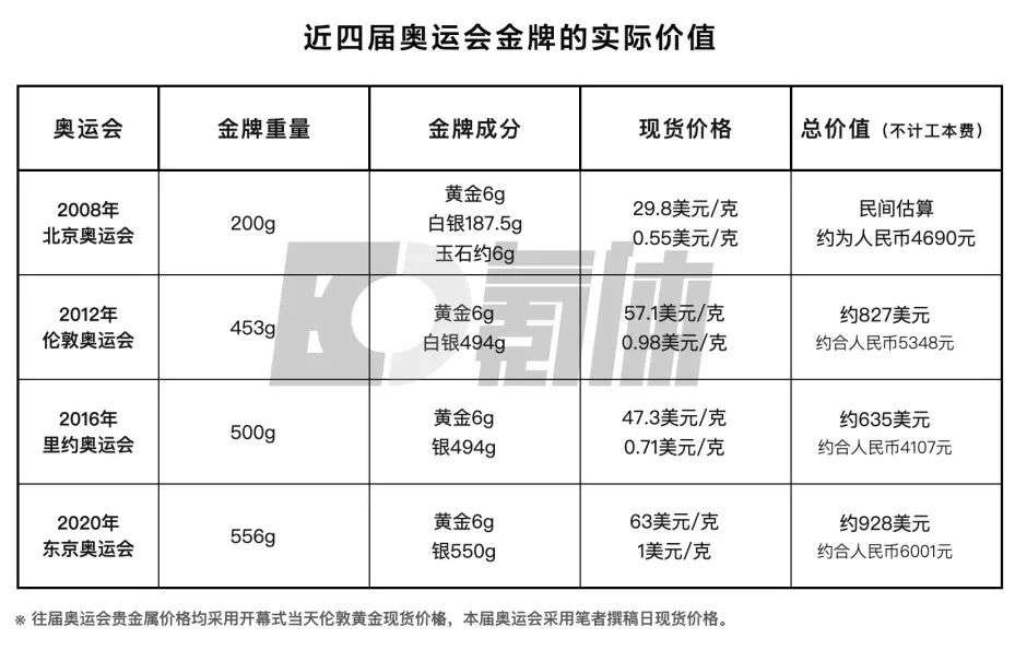 我们通过近四届奥运会的金牌重量与成分,并结合当时贵金属现货价格,为大家进行金牌实际价值盘点。如果只计算贵金属的实际价值,一块金牌的价值区间,约在人民币4000元-6000元之间。