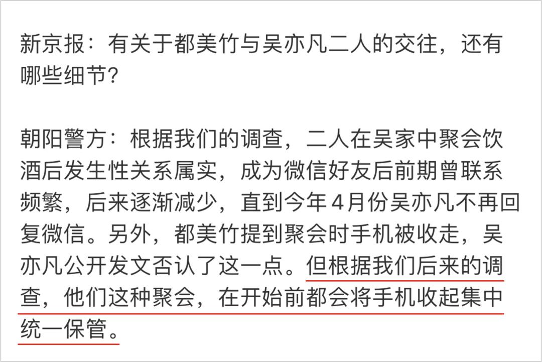 聚会开始前,都有把手机集中统一保管的习惯。而吴亦凡否认了这一点。
