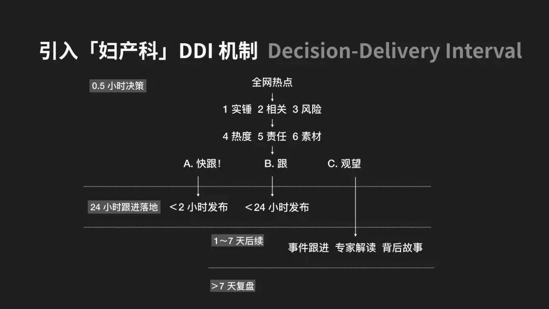 比如,下图这张是丁香医生的「内容生产机制」,为了保证输出内容快、狠、准,丁香医生引入了「妇产科」的 DDI 机制: