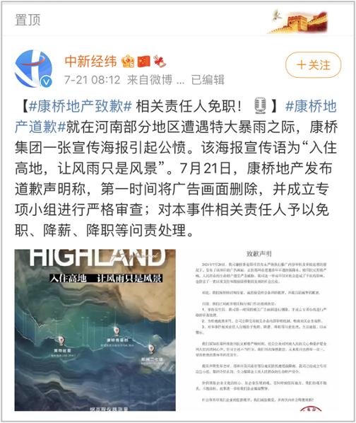 比如“河南暴雨”这件事中,就有一家房地产公司为蹭热点,试图将“暴雨”转为一次“商机”,遭到网友的炮轰,引起公愤。