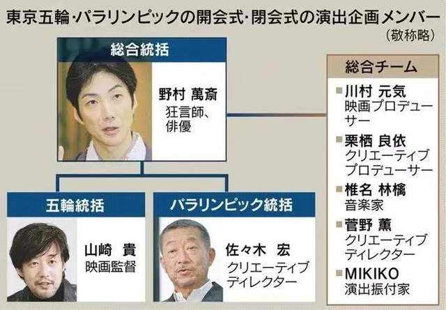 起初,奥运会开闭幕式总导演是山崎贵,但是由于他个人的电影拍摄进度问题,无法全身心参与到开幕式的设计,因此他主动退出团队。于是,开闭幕式总导演就成了总负责人野村万斋。