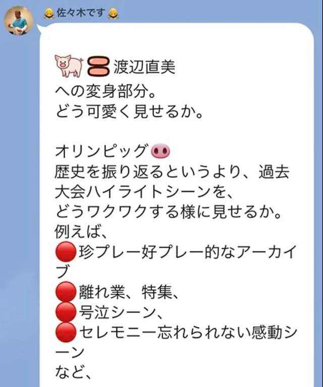 没想到《周刊文春》又爆猛料,在今年3月25日的刊物中曝光了佐佐木宏曾在LINE聊天中建议让著名搞笑女艺人渡边直美在奥运开幕式上扮猪,以对应「Olympig」的谐音烂梗。