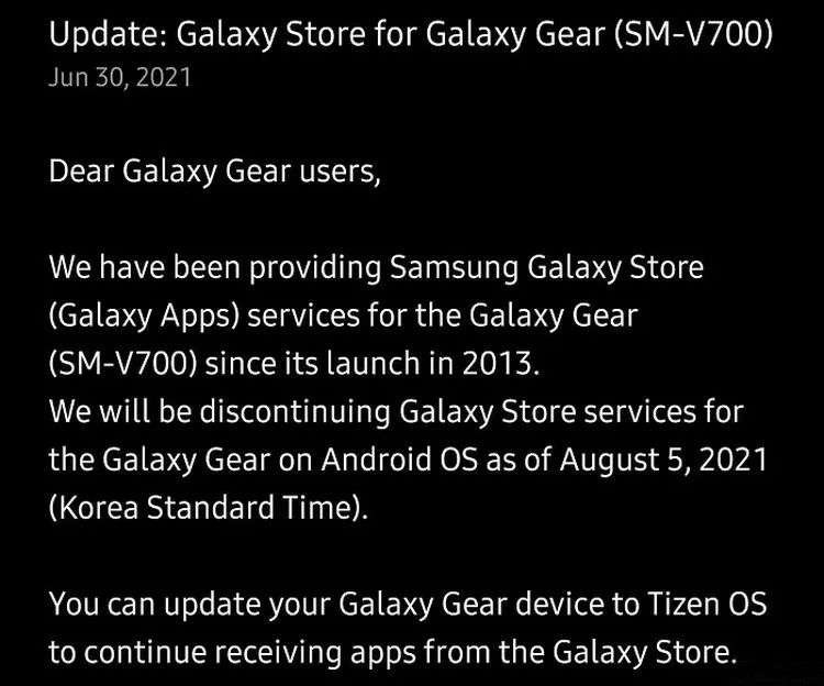 在这份系统更新通知中,三星方面指出,如果初代Galaxy Gear现在还运行着刚发布时的固件,那么内置的应用商店将会在今年8月停止运营,届时用户将无法使用其下载和更新应用,但及时更新到最新版的系统就可以免受影响,能够继续正常使用内置应用商店的功能。