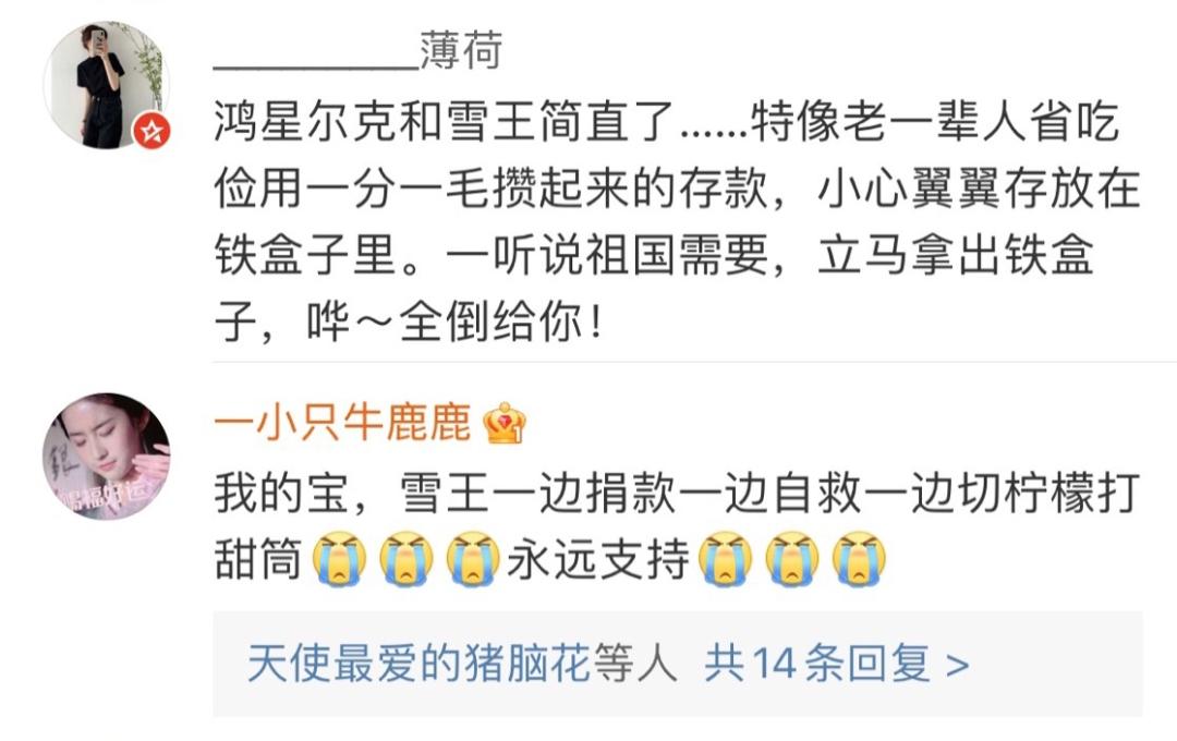 譬如卖4元柠檬水的蜜雪冰城,卖2块钱维C却捐了2个亿的东北制药,经营不善的特步拿出2000万,东拼西凑拿出100万元捐款的汇源。