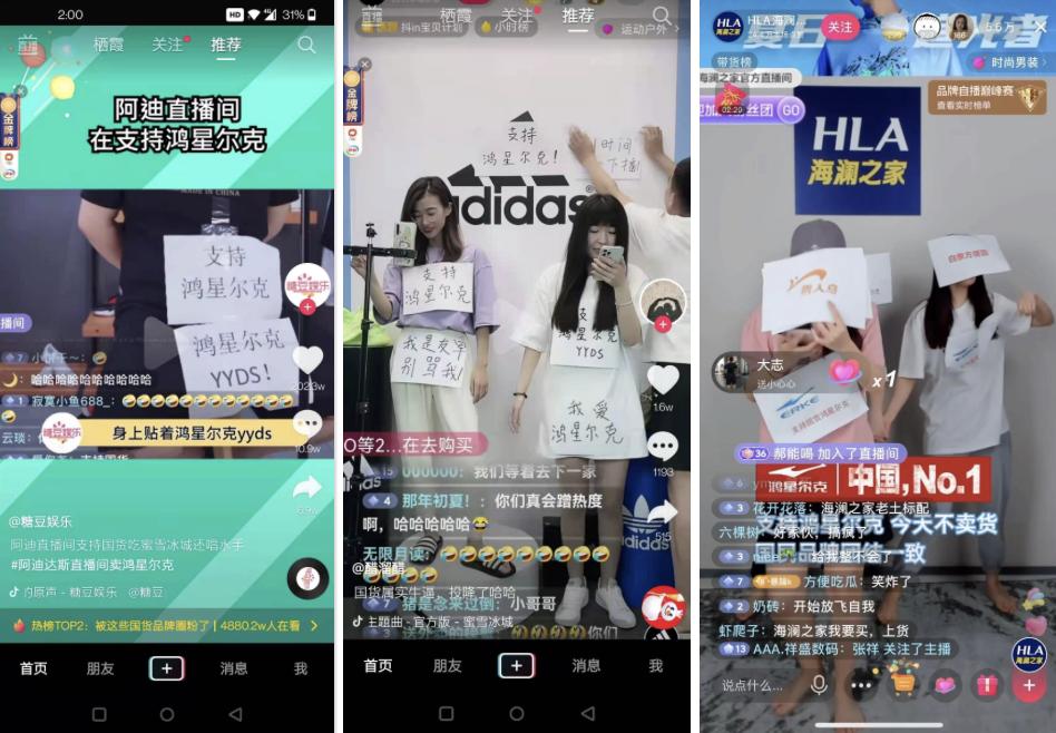 当这些为灾区贡献力量的民族品牌,被网友们点名表扬时,它们也开始了“梦幻联动”:鸿星尔克直播间里,主播在喝汇源果汁,放着蜜雪冰城的BGM。部分没买到鸿星尔克的网友,转身去买了贵人鸟。包括阿迪达斯、海澜之家等品牌,也开始支持“友军们”,阿迪达斯的主播往身上贴了“鸿星尔克YYDS”、“我爱鸿星尔克”的纸张,海澜之家也在自家直播间为贵人鸟、白家方便面、鸿星尔克等一众支援过灾区的品牌应援。
