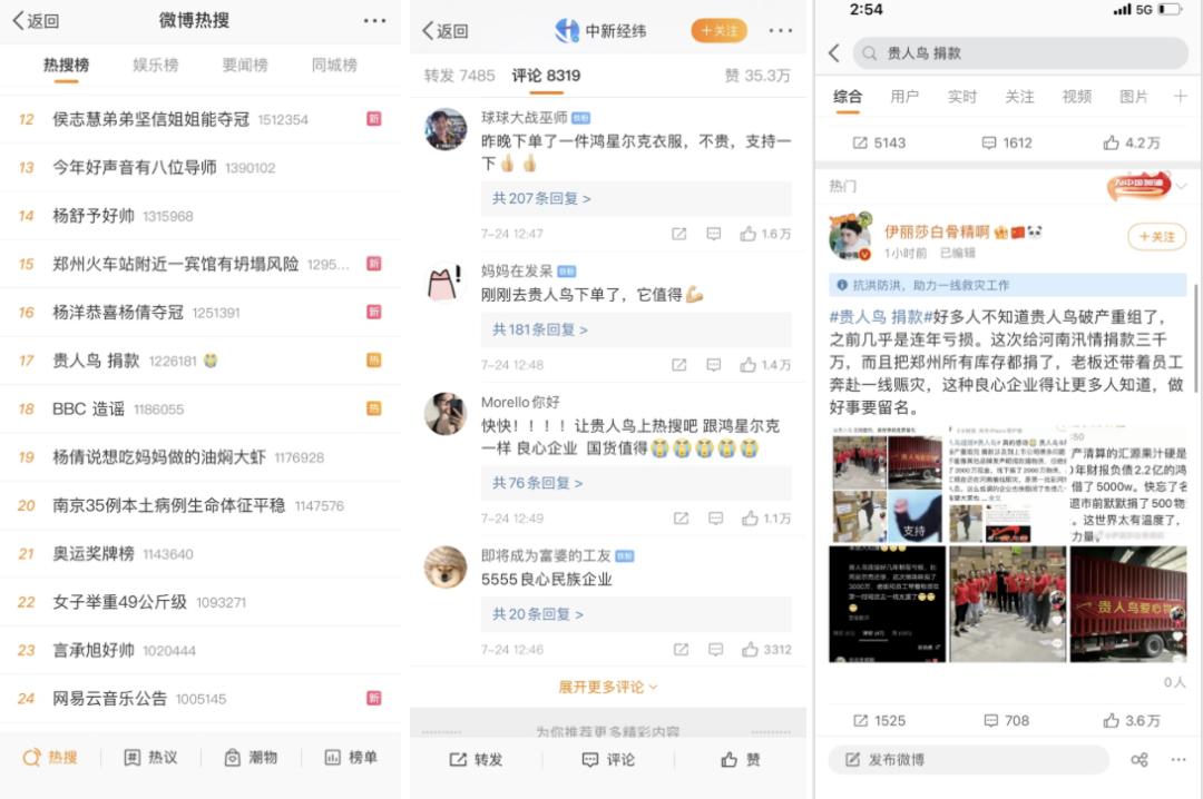 人们先从微博发现,转而在淘宝等电商平台搜索鸿星尔克,进入品牌官方直播间和主播进行互动,共情时下几单支持。