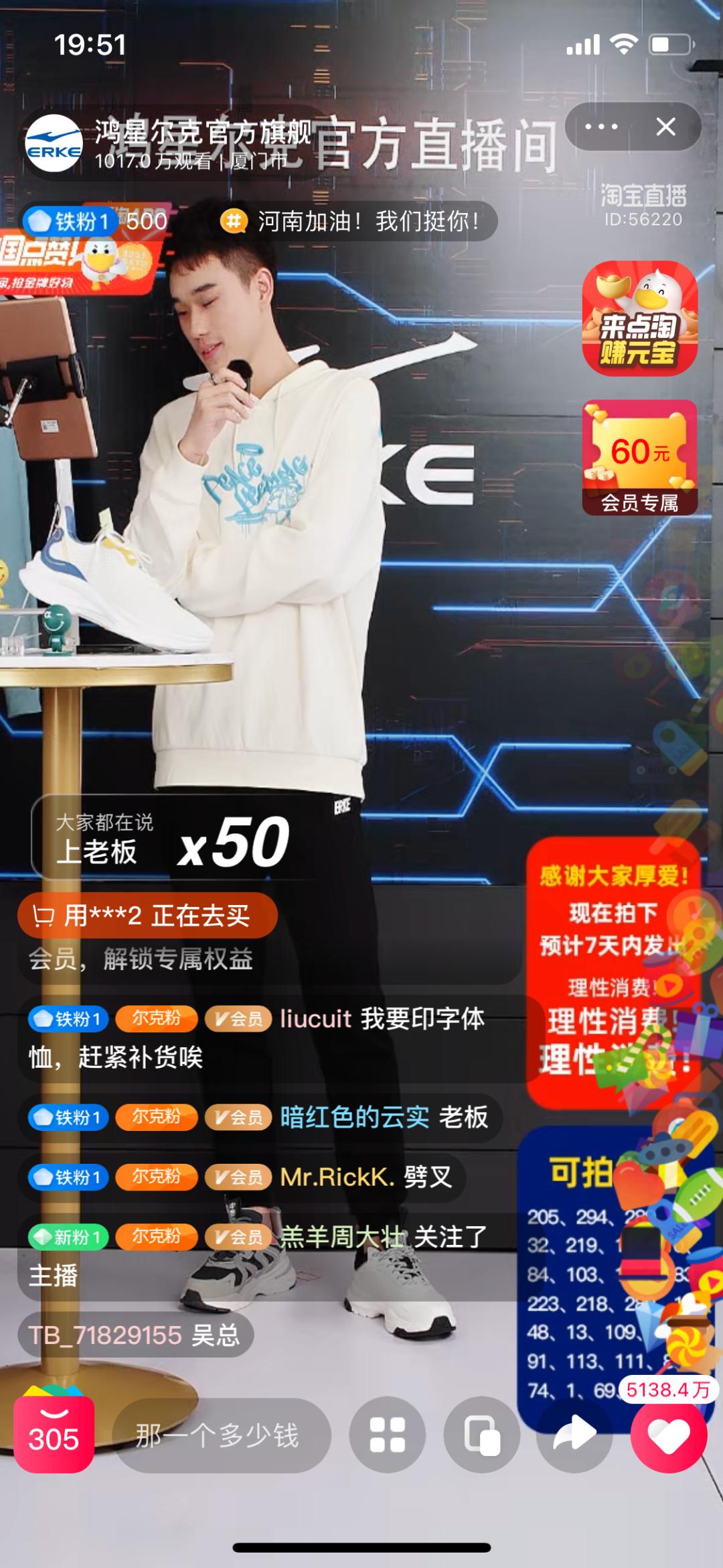 起初鸿星尔克还对突然涌进直播间的流量感到不适应,“我们播了这么久就俩人,从来没见过6万多人”。很快,直播间就变成了玩梗现场。尽管主播不断让大家“理性消费,买适合自己的码数”,留言区依旧不断飘过“野性消费!”、“给女朋友买的。没有不合适的码数,只有不合适的女朋友”,“上羽绒服吧,我开空调穿”,“给我上最贵的鞋!什么,只要369?”......