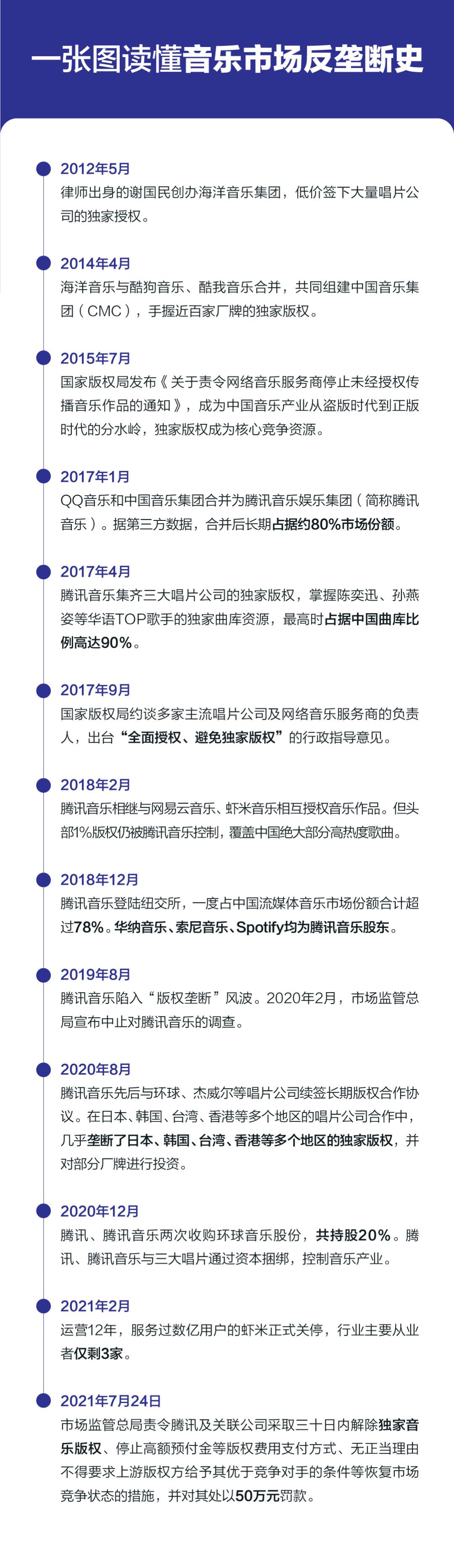 7月24日,国家市场监督管理总局官网发布对腾讯控股收购中国音乐集团的处罚结果:处以50万元罚款,同时在本决定发布之日起30日内解除独家版权协议等,并停止高额预付金等版权费用支付方式、不得实施最惠国待遇条款等恢复市场竞争状态的措施。