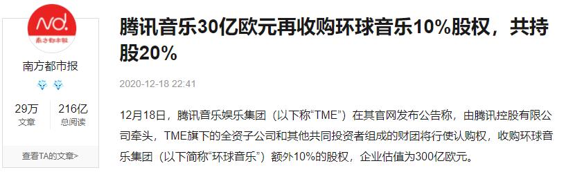 锌财经了解到,2016年7月12日,腾讯以QQ音乐业务投入中国音乐集团,获得中国音乐集团61.64%股权,取得对中国音乐集团的单独控制权,属于《反垄断法》第二十条规定的经营者集中。