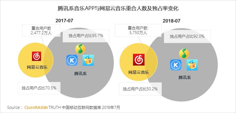 2015年,随着版权大战白热化,时任阿里音乐CEO宋柯曾多次表示,音乐市场已进入“双App时代”,认为用户需在阿里系和腾讯系各选一个App,以满足全部听歌需求。QuestMobile数据则显示,从2017年7月到2018年7月,网易云音乐和腾讯系音乐APP重合人数翻番。用户听歌需要来回切换APP,对体验造成不小影响,引发广泛吐槽。