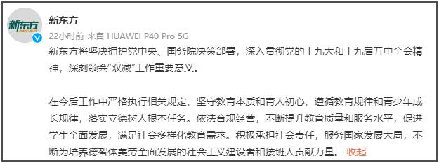 “双减”政策正式落地后,新东方也对此进行回应。新东方表示将坚决拥护党中央、国务院决策部署,深入贯彻党的十九大和十九届五中全会精神,深刻领会“双减”工作重要意义。在今后工作中严格执行相关规定,坚守教育本质和育人初心,遵循教育规律和青少年成长规律,落实立德树人根本任务。依法合规经营,不断提升教育质量和服务水平,促进学生全面发展,满足社会多样化教育需求。积极承担社会责任,服务国家发展大局,不断为培养德智体美劳全面发展的社会主义建设者和接班人贡献力量。