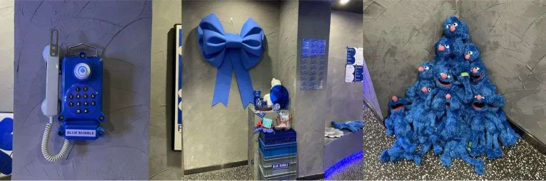 走进门店: 你会立刻被大面积的蓝色抓住眼球,菜单、电子屏背景、凳子、灯光、装饰品 (玩偶、装饰电话、墙上挂着的巨大蝴蝶结) 等等都是统一的克莱因蓝色。