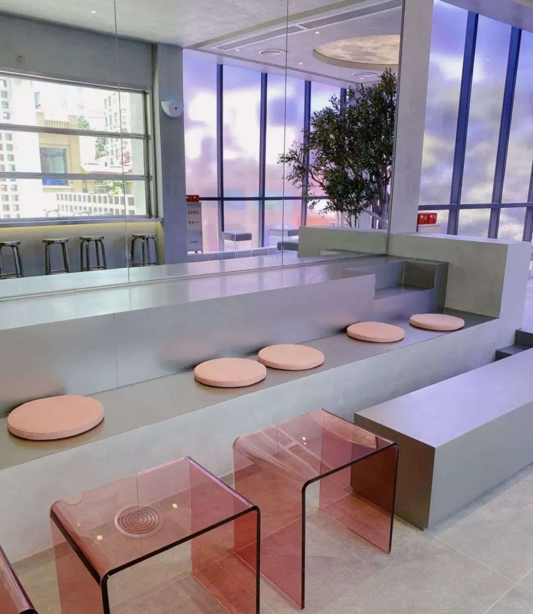 就餐区内的桌子、凳子都是淡淡的粉色,搭配淡紫色的灯光、丰富的绿植,整个门店散发着“仙女的气息”,出图率非常高。其粉紫色的鲜明风格也为品牌增加了传播点。