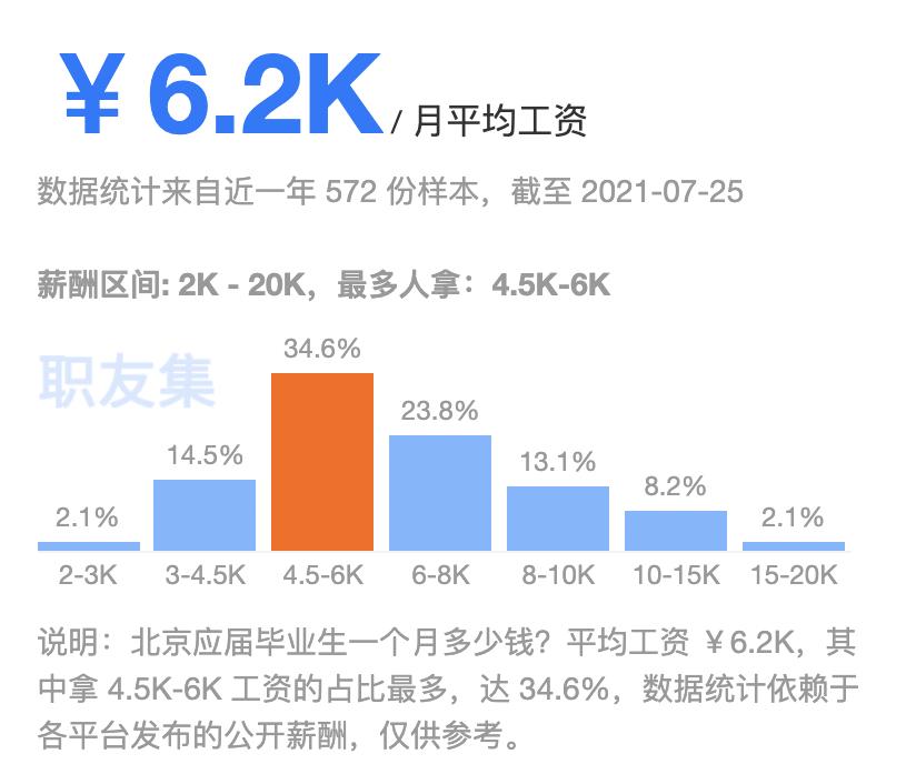 收入方面,北京基础竞争激烈,职友集数据显示,北京应届毕业生第一年的工资普遍都在6K左右。