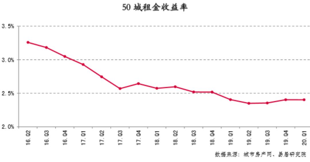 易居房地产研究院数据显示,全国50个典型城市租金收益率为2.3%。值得注意的是,这一收益率创下了多年来的最低值。(租金收益率=税后月租金-每月物业管理费)× 12/购买房屋总价)