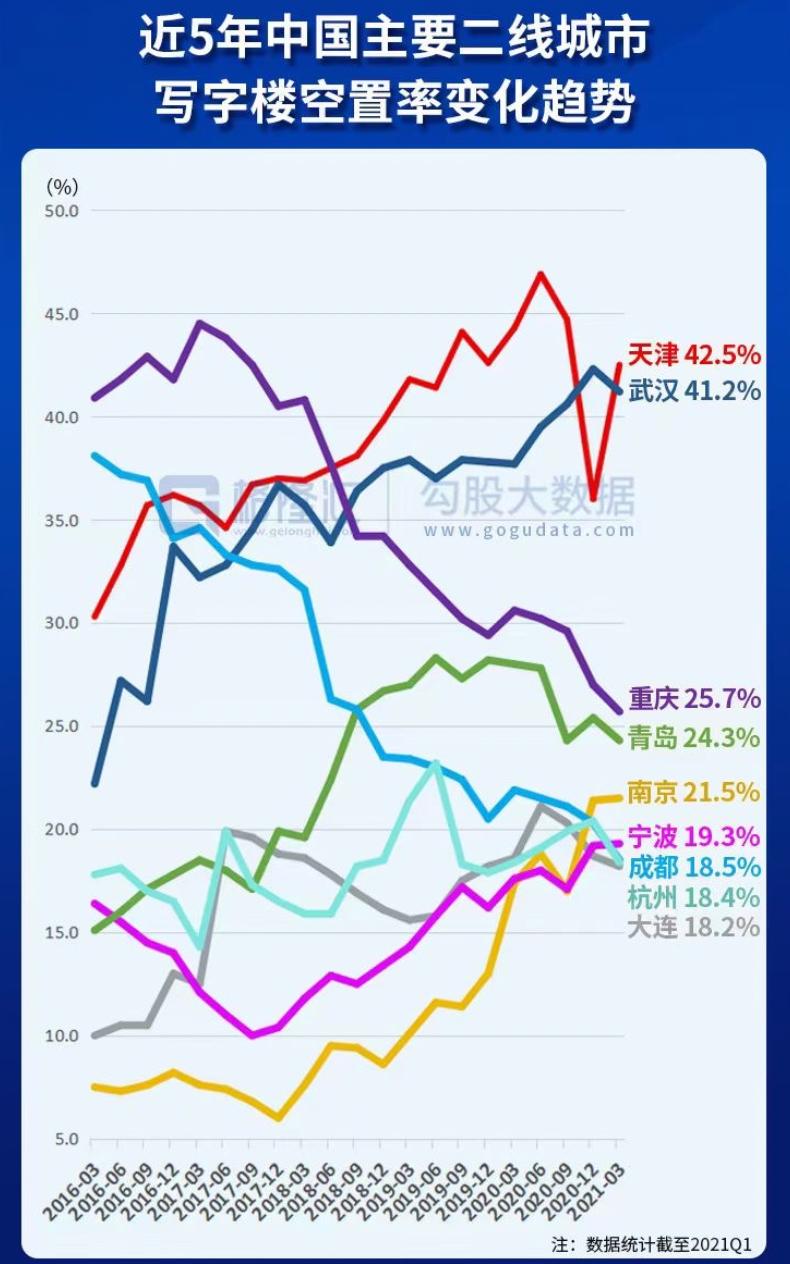 数据统计,2020年全国写字楼空置率在20%左右,一线城市最高的是深圳,高达21.4%,二线城市最高的是天津,高达42.5%。