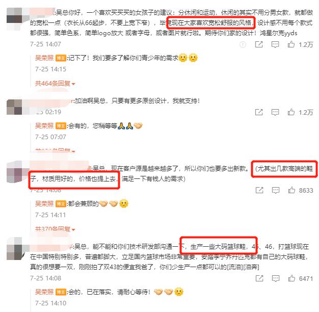 有网友在吴荣照的微博下留言称,“希望产品款式设计可以简约一些,色系搭配上可以不用饱和色系”;还有网友指出,“希望生产一些大码篮球鞋”、“可以拓展拖鞋等品类”。