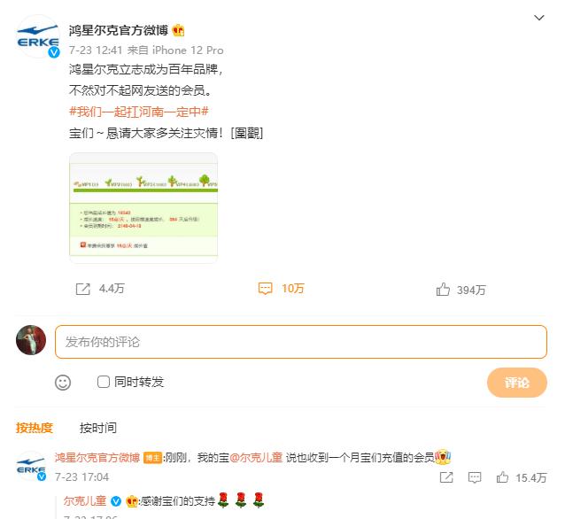 于是在网友们的集中发力下,目前鸿星尔克的微博会员年限被充值到了2140年。而公司发布的感谢微博获得了10万条评论、394万点赞,其中高赞网友表示,“鞋子质量还是要说一下,2012年在他家买的鞋子,今年就坏了”、“微博都不一定能活那么久”。