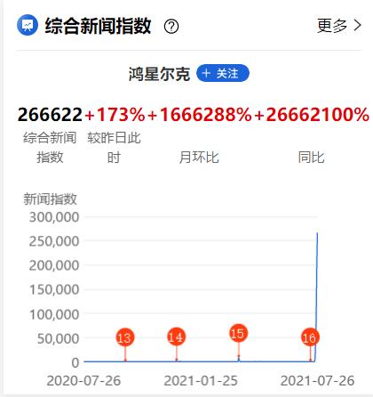 百度搜索指数显示,过去一周“鸿星尔克”整体日均值382405,同比增长42301%;同花顺iFind显示,鸿星尔克目前的综合新闻指数为266622,月环比增长1666288%,同比暴涨26662100%。