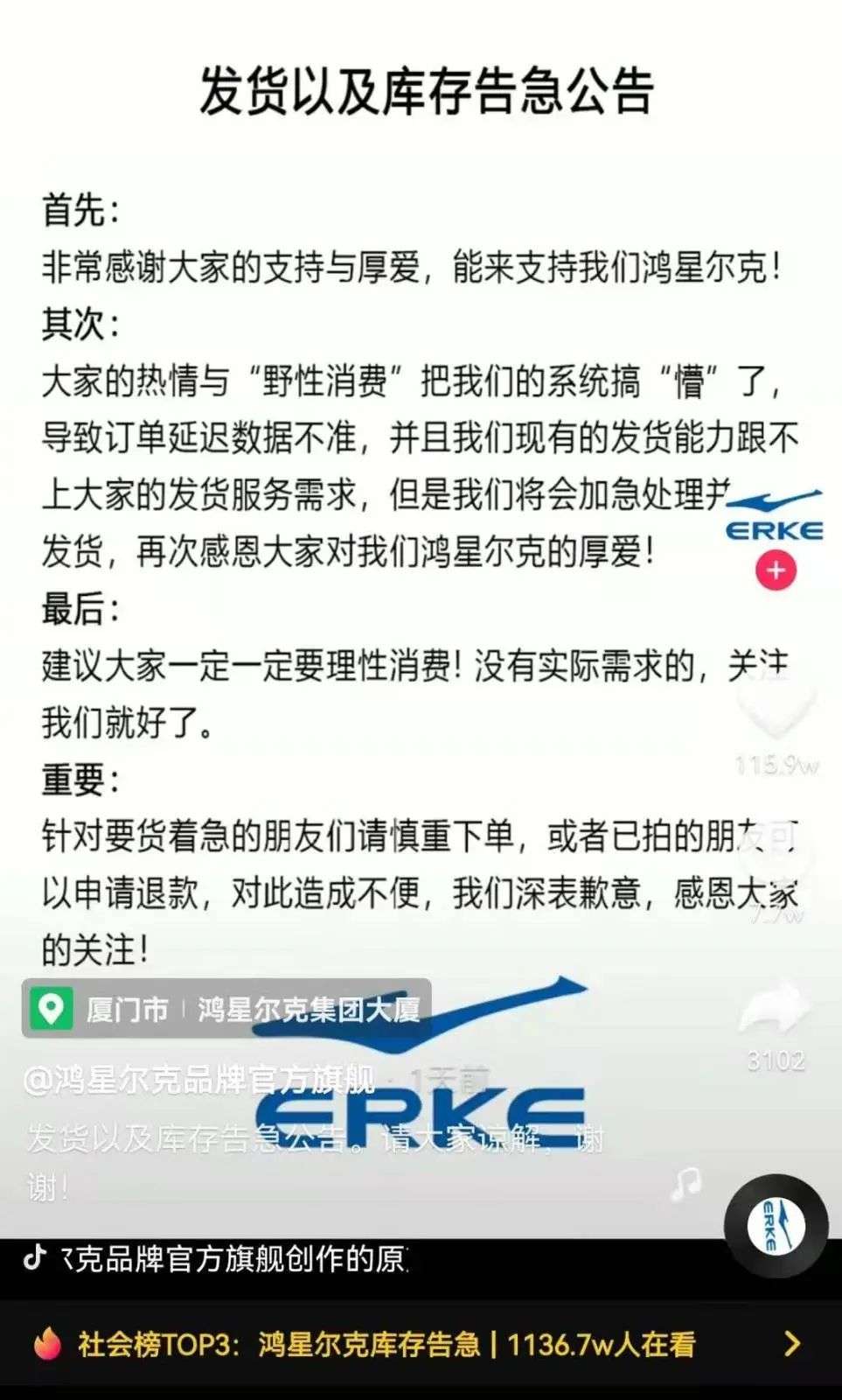 短短4天的“抢购”过后,7月25日,鸿星尔克紧急发布“库存告急公告”,称“现有的发货能力跟不上大家的发货服务需求,会加急处理并尽快发货”,同时再次强调建议大家理性消费。