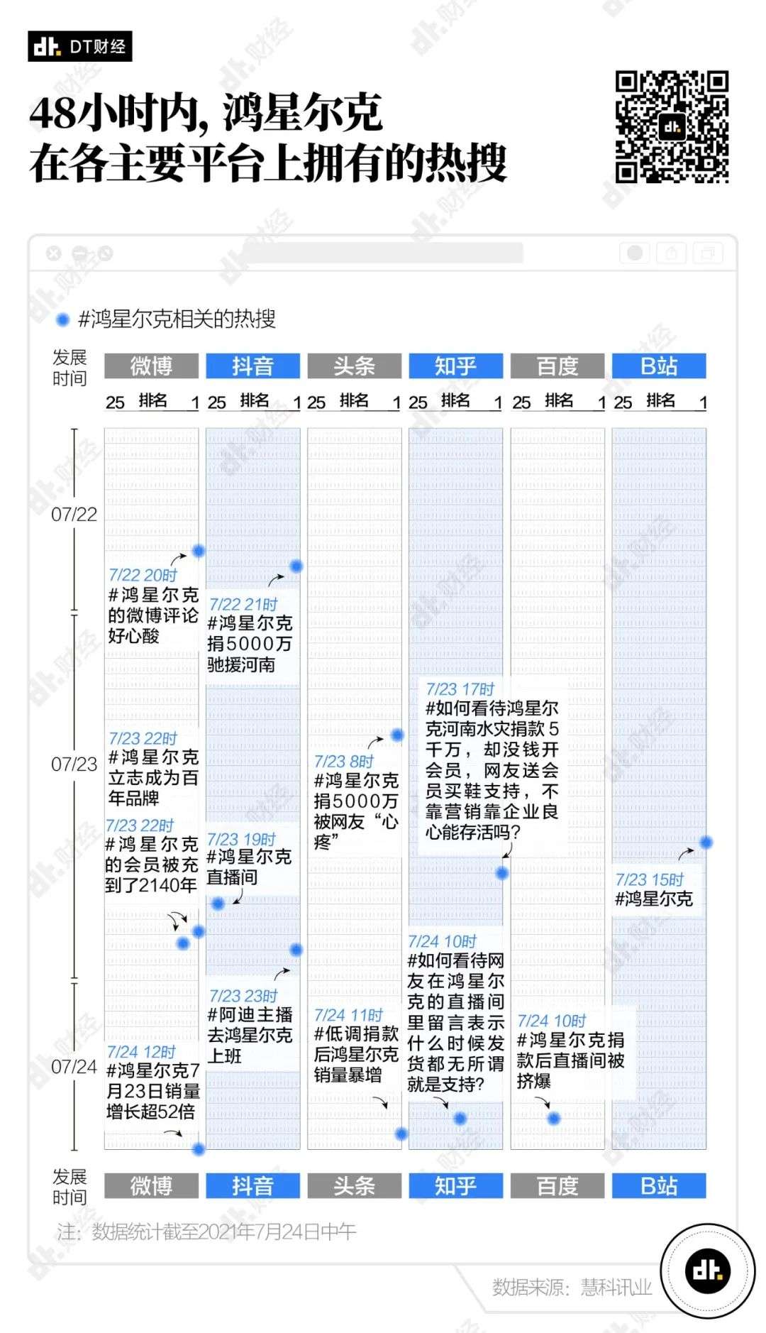 48小时内,鸿星尔克登上了微博、抖音、头条、知乎、百度、B站等各个平台的热搜/热门。