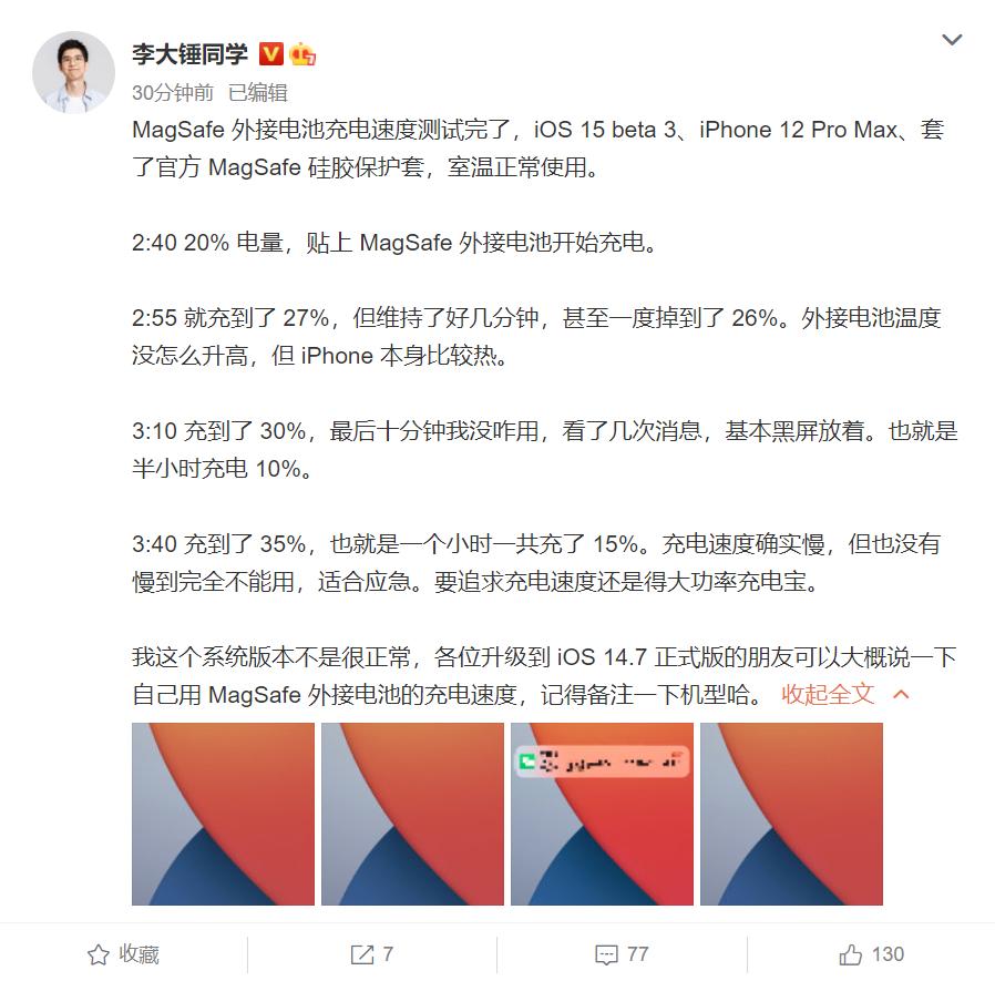 博主 @李大锤同学也进行了实测,发现给 iPhone 12 Pro Max 充电时半小时充电 10%,一个小时充电 15%。