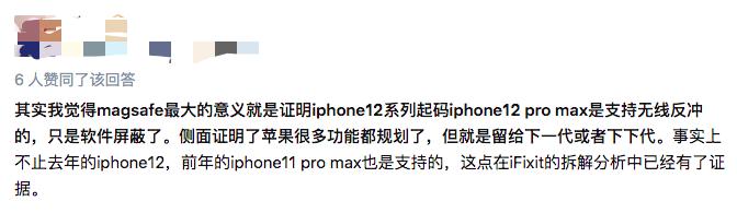 「其实我觉得magsafe最大的意义就是证明iphone12系列起码iphone12 pro max是支持无线反冲的,只是软件屏蔽了。侧面证明了苹果很多功能都规划了,但就是留给下一代或者下下代。」