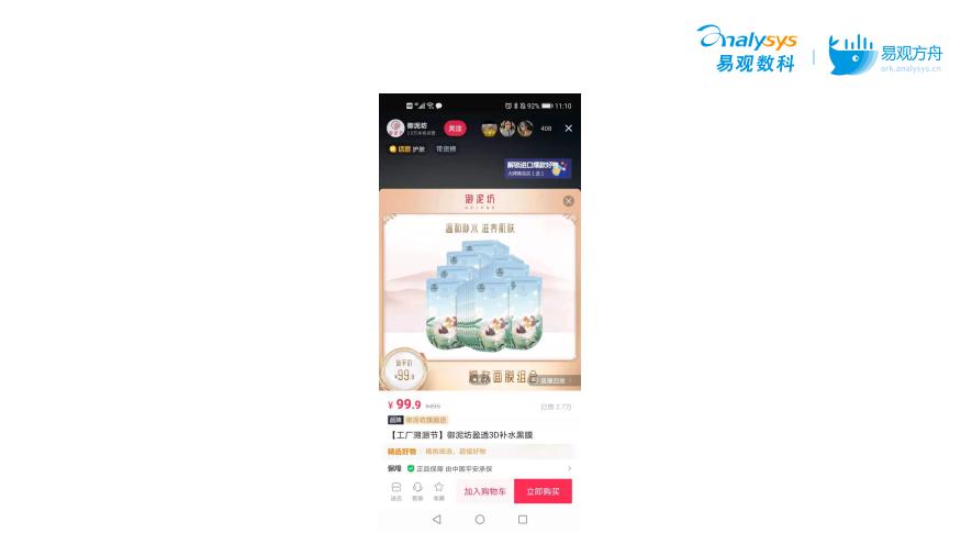 2020年4月,御泥坊母公司御家汇发布的财报显示,其全年收入为24亿,御家汇通过网红直播、短视频推广模式带来的收入占全年营业收入的比重约为10%左右。据营销自媒体人寻空盘点,御家汇在整个2019年与包括李佳琦、薇娅等超过1500位网红主播合作,累计超8000场平均到每天就有22场。如此高密度的规模推广下,即便按照财报显示的收入贡献10%计算,御家汇每场直播带货收入也不超过3万元。