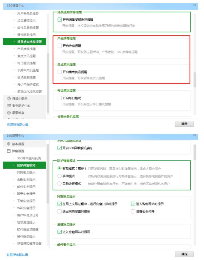 记者下载“极速版”使用一段时间后发现,此前令人头疼的弹窗广告的确消失了。记者在360设置中心查看“弹窗设置”进一步发现,产品推荐提醒和焦点资讯提醒在“极速版”中都默认关闭,在防护弹窗模式中,则默认开启智能模式,即只在发现风险、高危行为时弹窗提示,适合大部分用户。