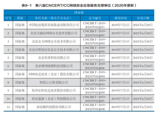 根据国家互联网应急中心(CNCERT/CC)发布的《2020年中国互联网网络安全报告》显示,奇虎、启明星辰、阿里云、深信服等均位列国家级网络安全应急服务支撑单位。
