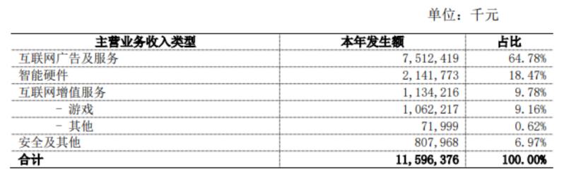 值得注意的是,尽管互联网广告及服务收入有所下降,但在主营业务收入中占比仍最高,达64.78%,智能硬件业务收入排在第二,占比达18.47%。