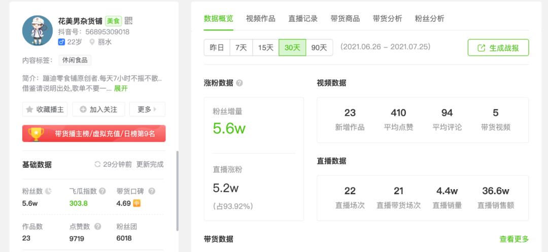一顿操作猛如虎,涨粉不过5万。根据飞瓜数据专业版显示,近30日内,该账号共直播22场,带货36.6万,这一成绩甚至不如“美少女零食铺”单场的GMV。