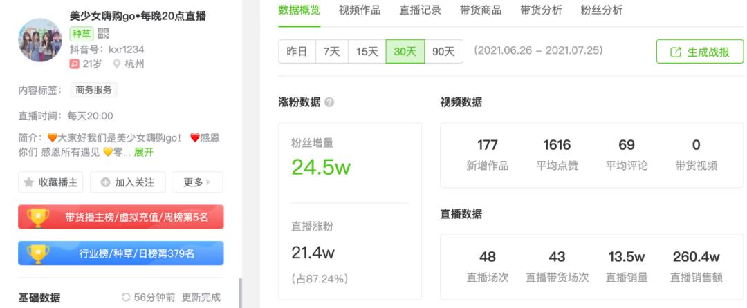 新账号“美少女嗨购go”6月21日正式开播,飞瓜数据专业版显示,该账号在近一个月内,涨粉24.5万,直播48场,共计带货260.4万。
