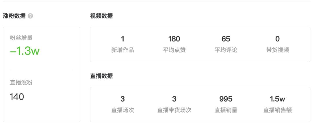 6月13日,“美少女零食铺”发布更名视频,改名为“美少女生活好物”,直播间换成了两男两女的配置,流量却一路下滑,门可罗雀。根据飞瓜数据显示,近一个月粉丝量不涨反掉,直播场次仅有三场,GMV1.5万,过于冷清。