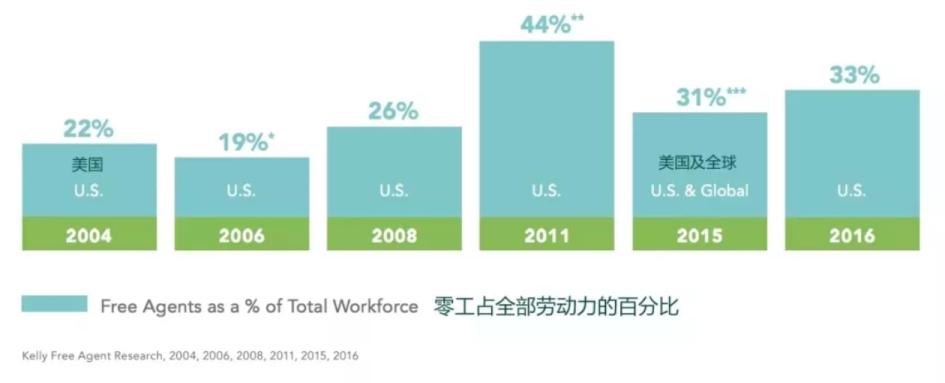 在中国,抛弃朝九晚五工作的“零工一族”军队也愈加壮大,阿里研究院2017年报告显示,到2036年,中国可能有多达4亿人将成为打零工人。