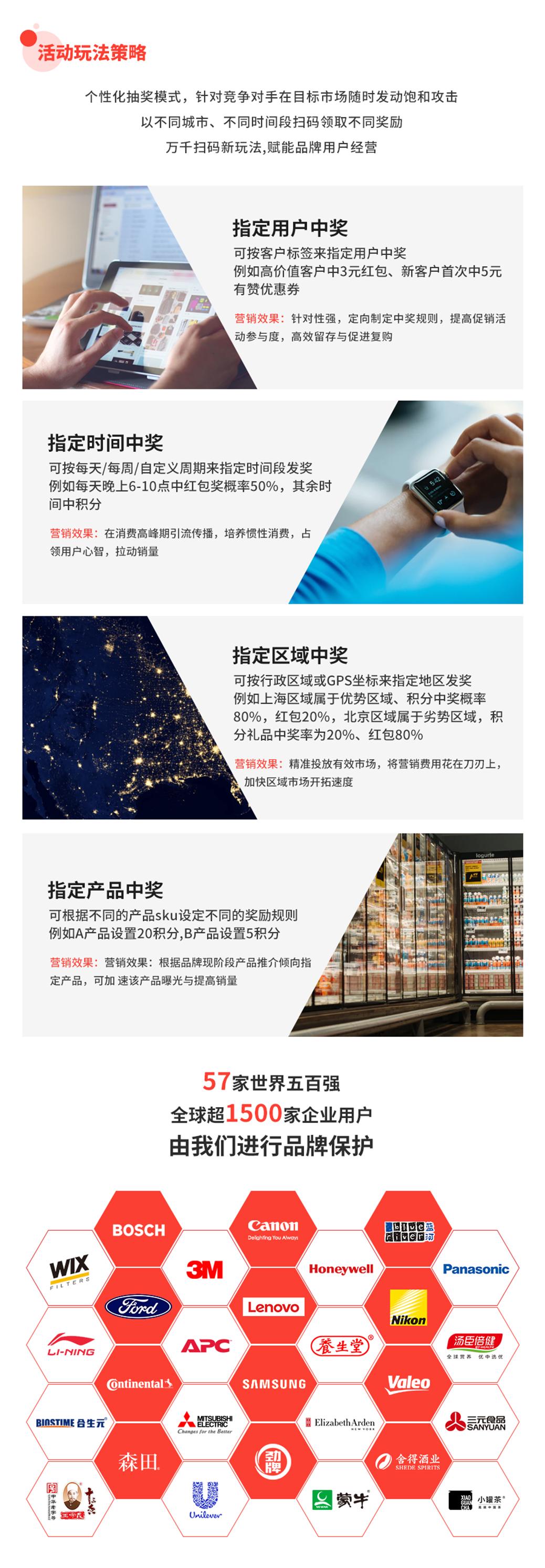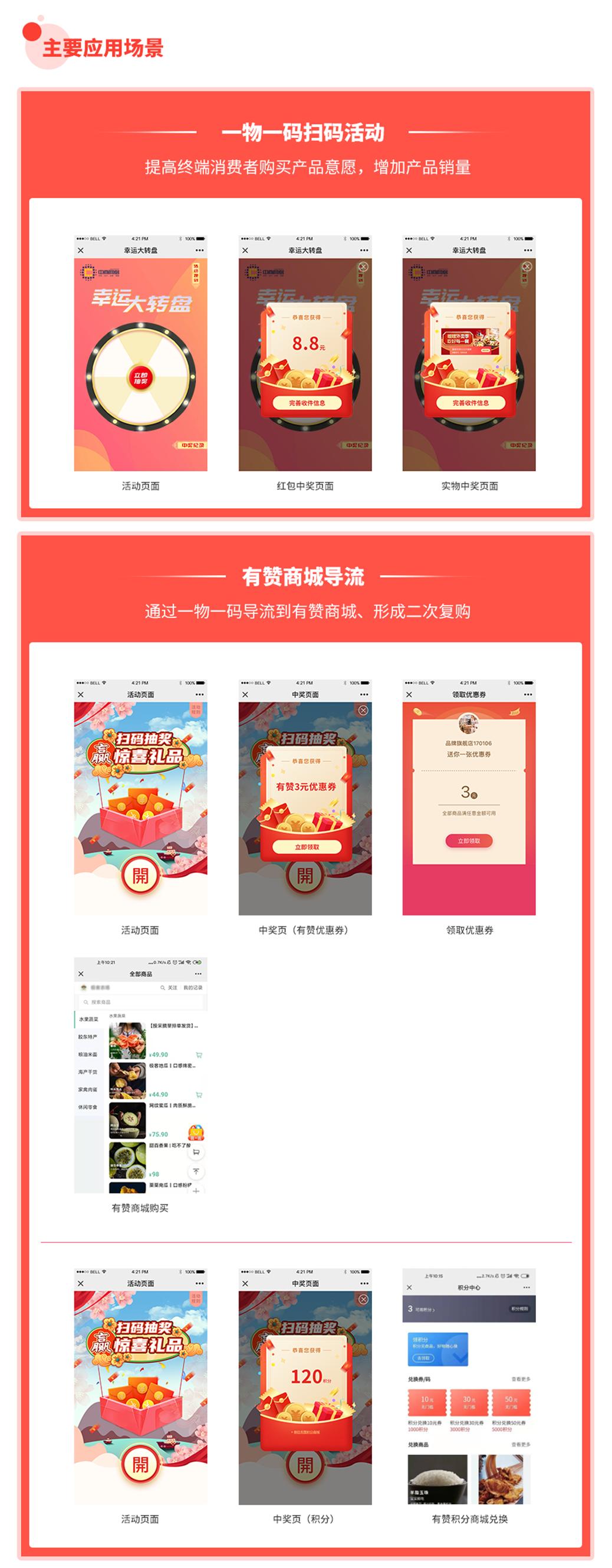 “一物一码”,简单来说,就是让每个产品拥有自己的专属码,成为其独一无二的身份标签。此项技术,在酒水,快消品以及食品安全等行业被普遍应用。基于一物一码,品牌能更好的解决溯源、防伪、防窜等难题;通过一物一码大数据反馈,了解地域、消费人群及消费场景,赋能市场决策;此外,还能展开多样的线上线下联动营销活动,如:互动抽奖、红包、优惠券馈赠等,提高复购的同时沉淀品牌私域流量。