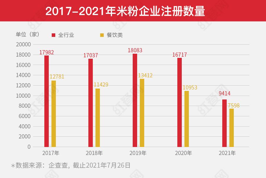 据企查查数据显示,自2017年起,截止2021年上半年,不到5年,新注册的米粉企业就接近了8万家,其中归属于餐饮行业大类的有近5.6万家,占比超过70%以上。